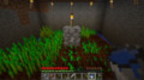 安全な住居は用意できたので、次は食糧事情をどうにかせねばならない。 我が家入口からちょっと行ったところに水辺があるので、ここを畑にして麦を植えることにする。 鍬を作成して土ブロックを耕し、周りに水路を掘って水分確保。 しばらくしてから様子を見…