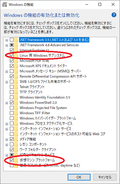下準備としてタスクバーの検索フォームから「Windowsの機能の有効化または無効化」を検索し、「Linux用Windowsサブシステム」「仮想マシンプラットフォーム」の2カ所にチェックが入っているかを確認します。入っていなければチェックを入れます。